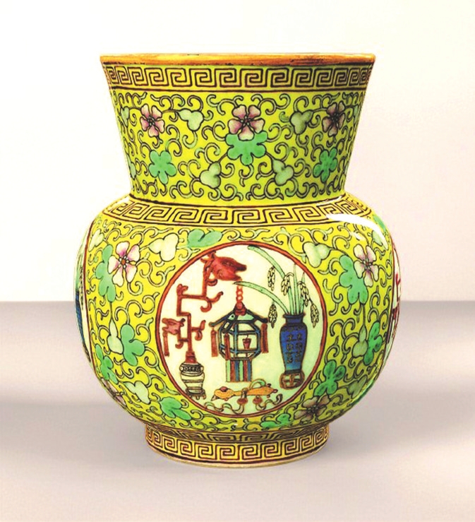 故宮博物院收藏的清代粉彩葫蘆萬代五谷豐登紋渣斗,內(nèi)壁繪粉彩纏枝葫蘆紋,藤蔓相連,花果繁茂,寓意“子孫綿延”“多子多?!?;外壁黃地亦繪相同葫蘆紋,設(shè)四處圓形開光,內(nèi)有宮燈、花瓶、如意、稻穗等,寓意“平安如意”“五谷豐登”。開光內(nèi)花瓶飾“囍”字,表明為皇帝大婚用瓷,既祈子嗣繁衍,又添喜慶吉祥。整器色彩明艷,紋飾繁密華麗,盡顯清代晚期宮廷裝飾的典型風(fēng)格。
