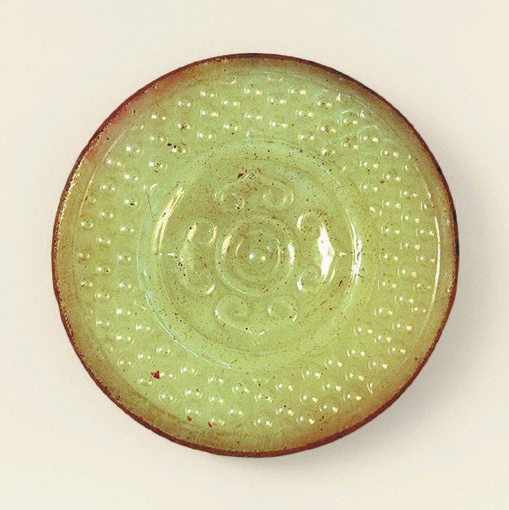 楚人好劍,有佩劍、贈劍、葬劍之風(fēng)。以玉器作為劍的裝具盛行于春秋戰(zhàn)國至漢代,當(dāng)時人們以玉具劍彰顯身份地位。一柄完整的玉具劍由劍首、劍格、劍璏、劍珌4個玉飾物組成。湖南不產(chǎn)玉,古代常以玻璃仿玉,器形多為璧、環(huán)、劍飾等。古代玻璃器出土極少,這件柿蒂紋谷紋玻璃劍首對研究我國古代玻璃器的源流具有重要意義。(雨林)