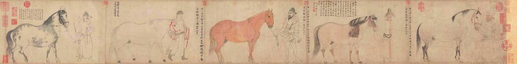 《五馬圖》以白描的手法畫了五匹名馬,依次為鳳頭驄、錦膊驄、好頭赤、照夜白、滿川花。每匹馬均有一個人牽引,其中兩人著西域服裝、三人穿漢人衣服,人馬均以單線勾勒,流暢而內(nèi)斂,反映出高超的白描技藝。
