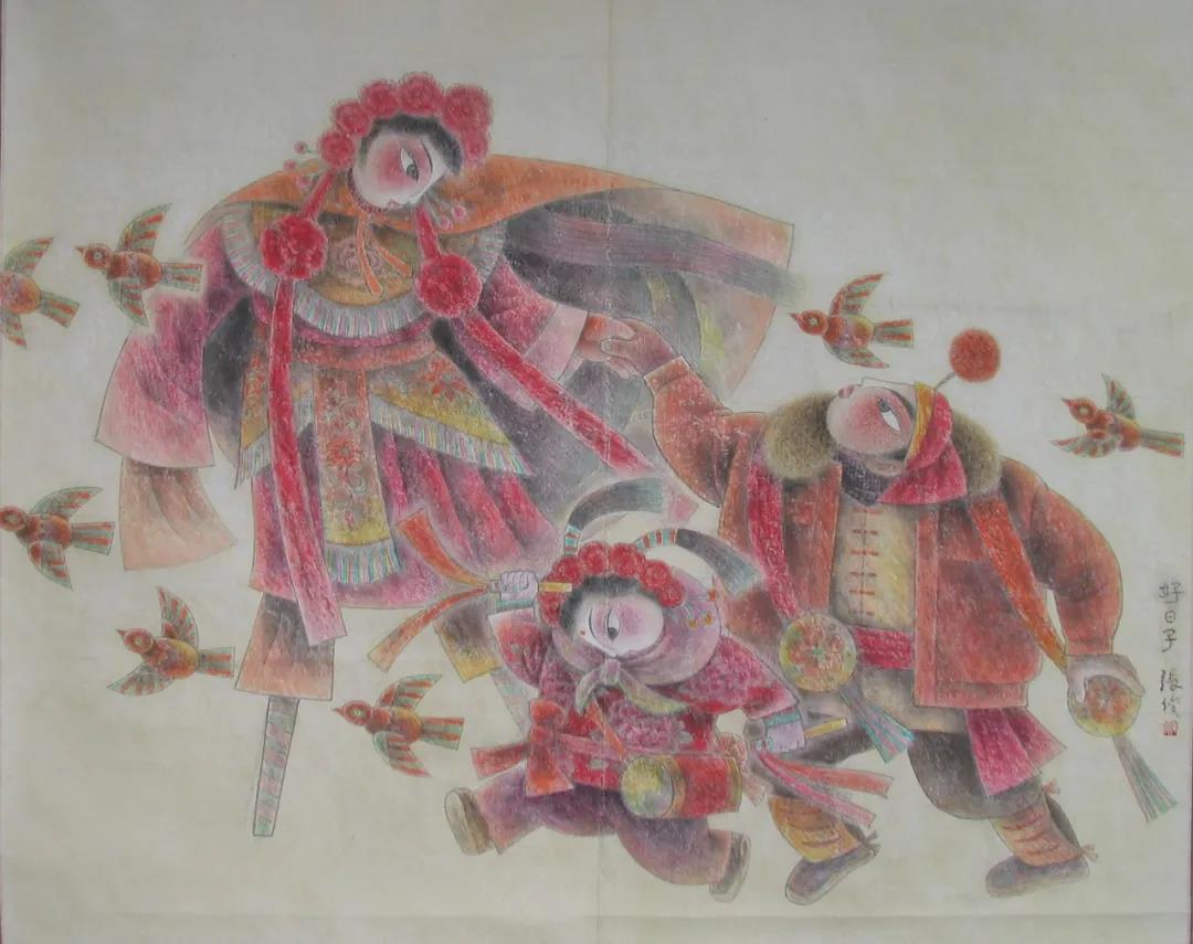 張俊這位畫家的畫就很有山西年畫的特點(diǎn),又吸收了山西民間藝術(shù)的東西,很有特色。這不光在其他省很少見,就是放到全國的展覽上也很少見。共性中的個性就是藝術(shù)。