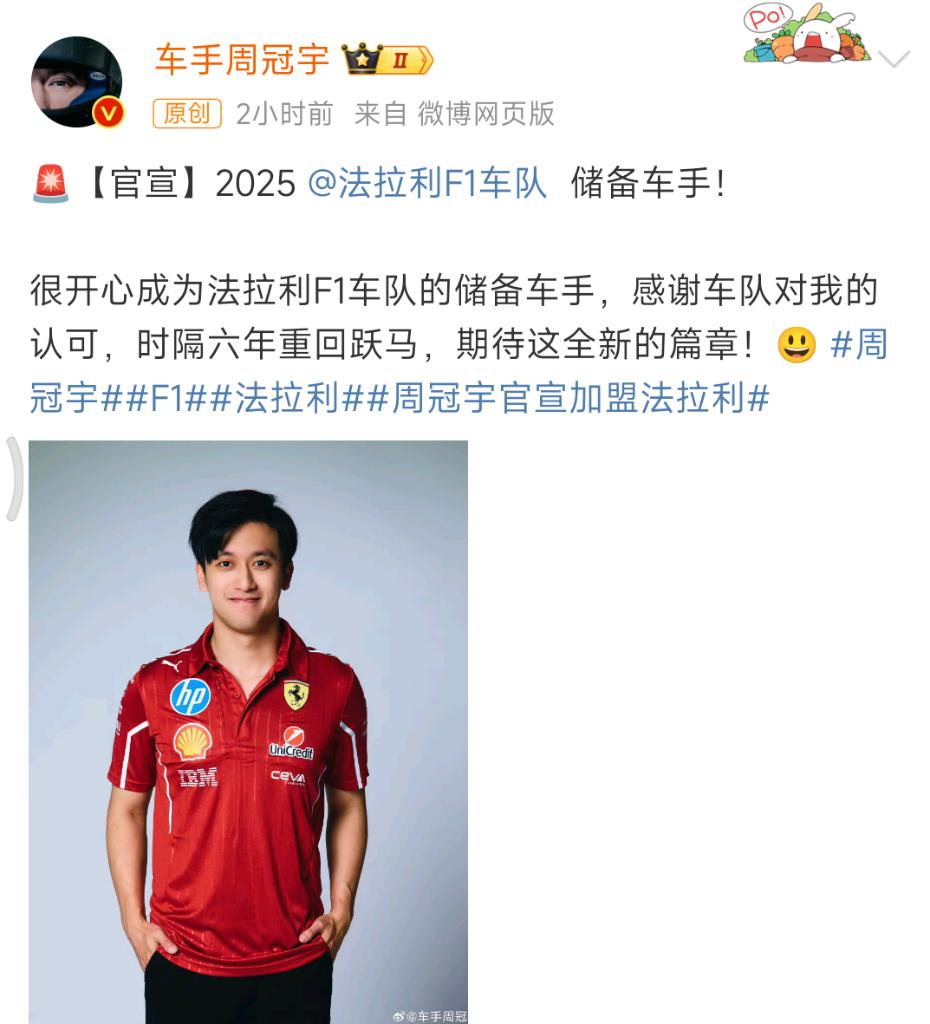 周冠宇通過個(gè)人社交平臺(tái)表示:“很開心成為法拉利F1車隊(duì)的儲(chǔ)備車手,感謝車隊(duì)對(duì)我的認(rèn)可,時(shí)隔六年重回‘躍馬’,期待這全新的篇章!”2015年至2018年間,周冠宇曾在法拉利青訓(xùn)學(xué)院度過四年時(shí)光。