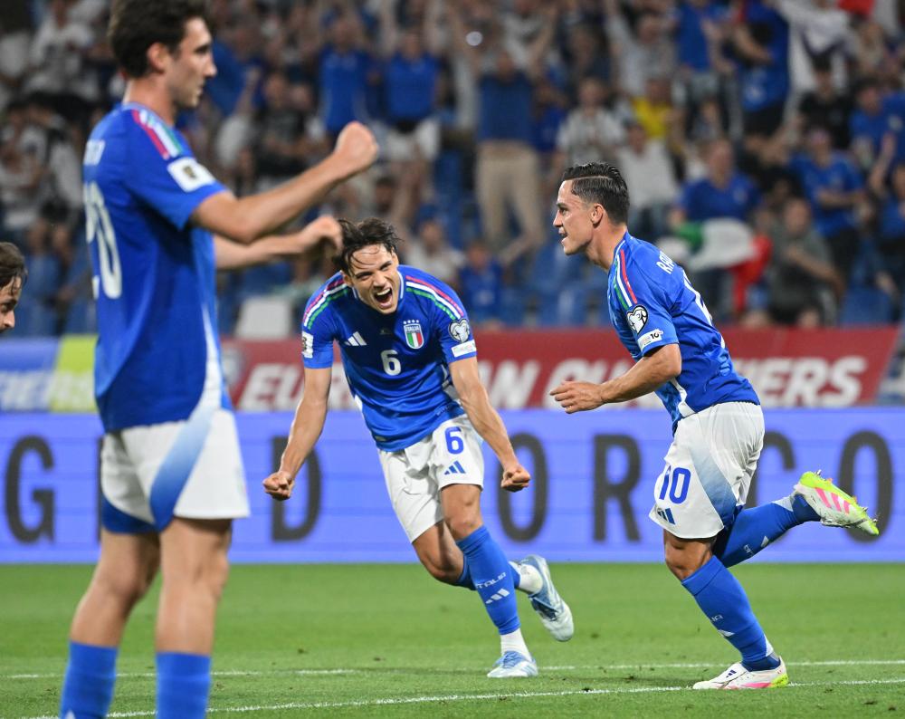 6月9日,意大利隊球員拉斯帕多里(右)慶祝進(jìn)球。新華社發(fā)(阿爾貝托·林格利亞攝)