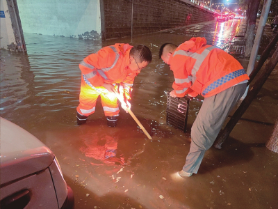 圖為北排洪文興路口,兩位工作人員合力抬起水泵,加緊抽排管網(wǎng)中的積水。本報(bào)通訊員攝