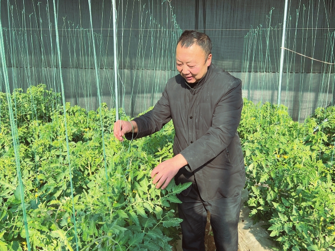 陽(yáng)高縣迎春蔬菜種植專(zhuān)業(yè)合作社負(fù)責(zé)人王學(xué)斌在育苗示范基地查看小番茄苗長(zhǎng)勢(shì)。 本報(bào)通訊員攝