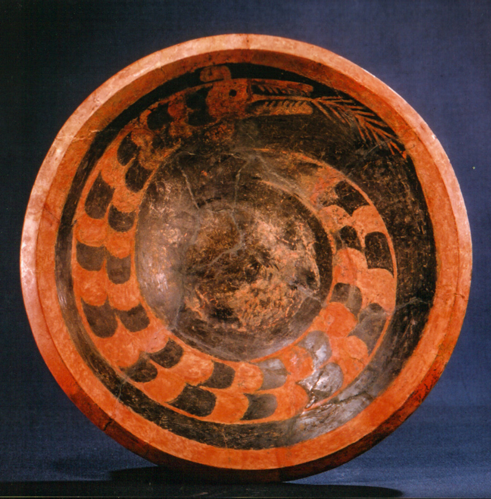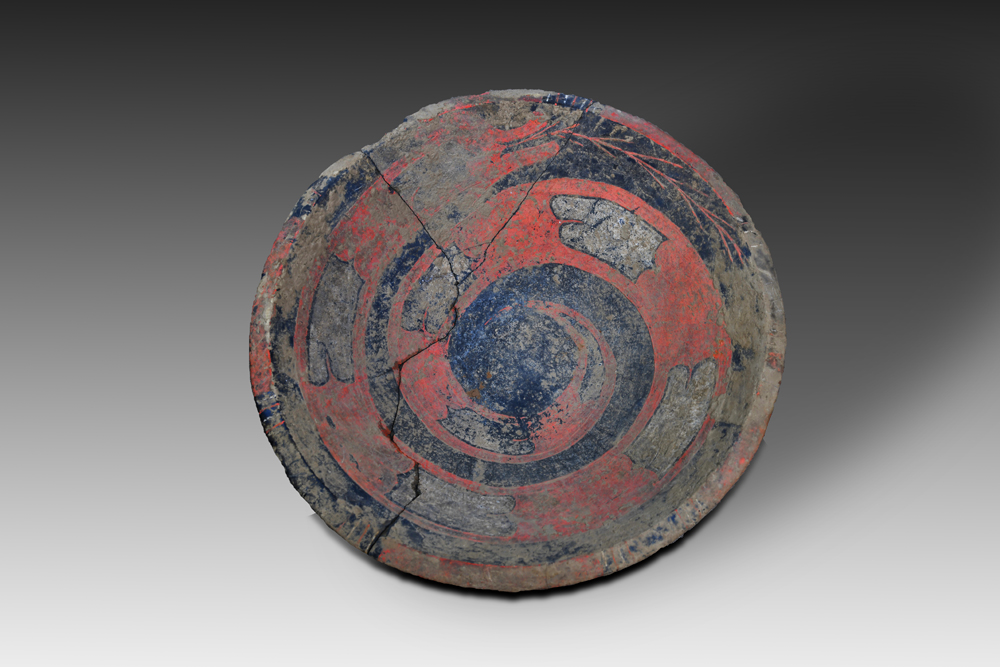 彩繪龍盤于1980年出土于陶寺遺址,灰褐色陶胎,敞口、折腹、平底,通體磨光。盤底用紅彩涂色,紅灰相間的蟠龍圍繞紅色圓盤面盤旋,蟠龍身盤如蛇,體上有似鱷魚一樣的鱗狀斑紋,口銜枝狀物,專家辨識后認(rèn)為是禾苗。
