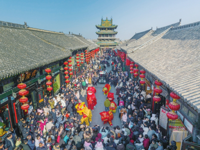 ③2月2日,民間藝人在平遙古城內(nèi)表演傳統(tǒng)民俗社火。