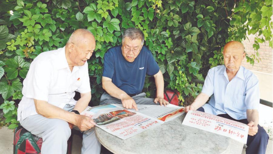 7月5日,在原市廣播局家屬院,老黨員們正在學(xué)習(xí)習(xí)近平總書(shū)記“七一”重要講話(huà)。(張存良 攝)
