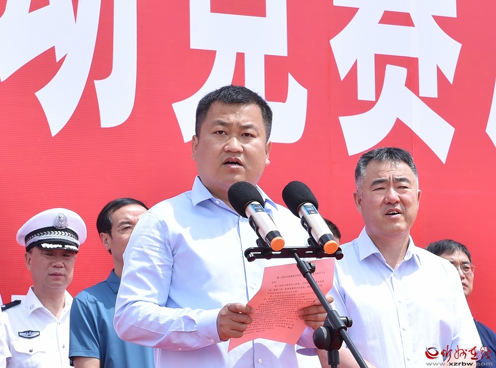 朱曉東宣布勞動(dòng)競(jìng)賽正式啟動(dòng)。馮曉磊 攝 李建國(guó)指出,太忻、忻原、東環(huán)路建設(shè)項(xiàng)目是市委、市政府深入貫徹落實(shí)省委“一群兩區(qū)三圈”城鄉(xiāng)區(qū)域發(fā)展新布局,推動(dòng)太忻一體化經(jīng)濟(jì)區(qū)建設(shè)強(qiáng)勢(shì)起步的重要舉措。為加快推進(jìn)工程建設(shè),市委、市政府決定開(kāi)展2022年太忻、忻原、東環(huán)路建設(shè)項(xiàng)目勞動(dòng)競(jìng)賽,強(qiáng)化各參建單位的榮譽(yù)感、責(zé)任感、使命感,激發(fā)廣大參建人員開(kāi)拓創(chuàng)新的干勁和攻堅(jiān)克難的勇氣,一鼓作氣、乘勢(shì)而上,確保太忻大道、忻原大道、東環(huán)路在國(guó)慶節(jié)前如期通車,以實(shí)際行動(dòng)迎接黨的二十大勝利召開(kāi)。