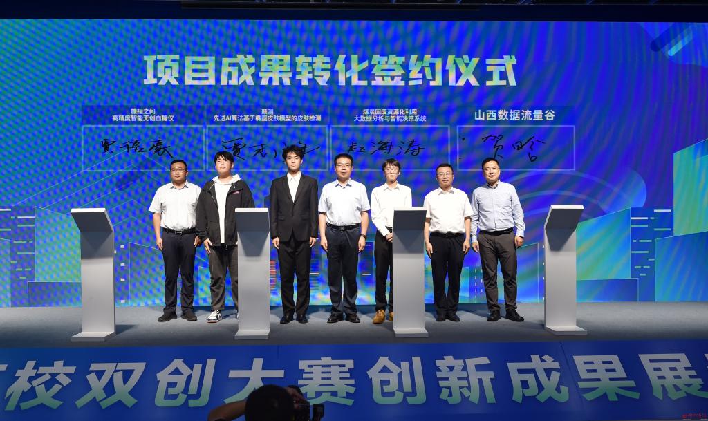 項(xiàng)目成果轉(zhuǎn)化簽約儀式現(xiàn)場。馮曉磊 攝 9月16日,首屆數(shù)字經(jīng)濟(jì)高校雙創(chuàng)大賽創(chuàng)新成果展示暨頒獎典禮在忻州舉辦。省委書記藍(lán)佛安致賀信,教育部副部長、黨組成員孫堯發(fā)表視頻致辭,省委常委、統(tǒng)戰(zhàn)部部長徐廣國出席活動。省委統(tǒng)戰(zhàn)部副部長、省工商聯(lián)黨組書記陳旭忠,省教育廳黨組書記、廳長馬駿,省工商聯(lián)主席景普秋,省科協(xié)黨組書記、副主席丁紀(jì)崗,市委書記朱曉東,市委副書記、市長李建國,省委統(tǒng)戰(zhàn)部副部長郭延斌,省工信廳副廳長尚阿浪,團(tuán)省委副書記陳鍇,省工商聯(lián)副主席李劍英,副市長、太忻經(jīng)濟(jì)一體化發(fā)展忻州區(qū)運(yùn)營中心黨委書記、主任王建峰出席活動。 藍(lán)佛安在賀信中指出,當(dāng)今時代,數(shù)字浪潮正以迅速崛起、深度滲透的姿態(tài)席卷而來,成為影響全球格局、重塑競爭秩序、加速時代變革的重要力量。近年來,山西深入學(xué)習(xí)貫徹習(xí)近平總書記關(guān)于發(fā)展數(shù)字經(jīng)濟(jì)的重要論述,認(rèn)真貫徹落實(shí)黨的二十大關(guān)于“加快建設(shè)網(wǎng)絡(luò)強(qiáng)國、數(shù)字中國”的重大部署,大力推動產(chǎn)業(yè)數(shù)字化和數(shù)字產(chǎn)業(yè)化,全省數(shù)字經(jīng)濟(jì)跑出加速度、邁上新臺階。省委十二屆六次全會明確將推動數(shù)字經(jīng)濟(jì)發(fā)展壯大作為六大轉(zhuǎn)型行動之一,必將為山西進(jìn)一步加快轉(zhuǎn)型發(fā)展、奮進(jìn)“兩個基本實(shí)現(xiàn)”目標(biāo)注入強(qiáng)勁動能。 藍(lán)佛安強(qiáng)調(diào),數(shù)字經(jīng)濟(jì)高質(zhì)量發(fā)展,關(guān)鍵在創(chuàng)新,根本靠人才。數(shù)字經(jīng)濟(jì)高校雙創(chuàng)大賽為大學(xué)生青年才俊擁抱數(shù)字浪潮、投身創(chuàng)業(yè)創(chuàng)新提供了新的平臺,在高校、企業(yè)、資本和創(chuàng)新項(xiàng)目之間搭建了新的橋梁。希望同學(xué)們打牢知識基礎(chǔ)、勇攀科技高峰,以昂揚(yáng)向上的朝氣、敢為人先的銳氣,在探索美好未來、逐夢數(shù)字時代的征途上大展身手,努力為實(shí)現(xiàn)中華民族偉大復(fù)興的中國夢貢獻(xiàn)智慧和力量。同時,也希望參與和支持本次大賽的省內(nèi)外各高校、企業(yè)和機(jī)構(gòu),攜起手來,加強(qiáng)合作,共創(chuàng)數(shù)字山西美好未來,助力數(shù)字中國建設(shè)。 孫堯在致辭中強(qiáng)調(diào),黨的二十大報告中指出“教育、科技、人才是全面建設(shè)社會主義現(xiàn)代化國家的基礎(chǔ)性、戰(zhàn)略性支撐”,山西省教育廳和省工商聯(lián)主辦的這場數(shù)字經(jīng)濟(jì)高校雙創(chuàng)大賽,是培養(yǎng)數(shù)字經(jīng)濟(jì)創(chuàng)新創(chuàng)業(yè)人才的有效途徑,也是推動數(shù)字經(jīng)濟(jì)產(chǎn)教融合創(chuàng)新發(fā)展的重要平臺,對促進(jìn)高校學(xué)生創(chuàng)新創(chuàng)業(yè)、推動項(xiàng)目落地見效具有積極作用。希望這些年輕的創(chuàng)業(yè)者繼續(xù)保持創(chuàng)新的激情,成為民營經(jīng)濟(jì)數(shù)字化轉(zhuǎn)型的中堅(jiān)力量。希望大賽持續(xù)舉辦,將其打造為我國數(shù)字經(jīng)濟(jì)領(lǐng)域的一個重要平臺,營造鼓勵創(chuàng)新創(chuàng)業(yè)創(chuàng)造的社會氛圍,推動數(shù)字經(jīng)濟(jì)的蓬勃發(fā)展。 據(jù)介紹,這是全國首個圍繞數(shù)字經(jīng)濟(jì)領(lǐng)域,面向高校學(xué)子的雙創(chuàng)大賽。大賽以“輕輕聯(lián)動·數(shù)實(shí)融合”為主題,旨在為高校、政府、企業(yè)、資本和創(chuàng)新項(xiàng)目之間建立起溝通橋梁,推動數(shù)字經(jīng)濟(jì)領(lǐng)域人才培養(yǎng),助力山西數(shù)字經(jīng)濟(jì)高質(zhì)量發(fā)展。大賽圍繞產(chǎn)業(yè)數(shù)字化、數(shù)字產(chǎn)業(yè)化設(shè)置創(chuàng)新創(chuàng)業(yè)和新媒體雙賽道,通過打造高水平的創(chuàng)新創(chuàng)業(yè)平臺,積極引導(dǎo)高校畢業(yè)生留創(chuàng)本地,助力年輕人實(shí)現(xiàn)創(chuàng)新創(chuàng)業(yè)夢想,共同為山西數(shù)字經(jīng)濟(jì)高質(zhì)量發(fā)展“添磚加瓦”。 大賽自6月5日正式啟動以來,獲得全國60多所高校、近百家數(shù)字經(jīng)濟(jì)企業(yè)的積極響應(yīng),大賽抖音話題#這YOUNG很山西#累計播放量已突破1.1億次,線上線下累計參賽人數(shù)超10萬人。創(chuàng)新創(chuàng)業(yè)賽道報名項(xiàng)目525組,項(xiàng)目領(lǐng)域涵蓋數(shù)字文娛、數(shù)字能源、數(shù)字農(nóng)業(yè)、數(shù)字智造、數(shù)字醫(yī)療、數(shù)字教育、數(shù)字生活、數(shù)字基建等多個方面,最終甄選出12組數(shù)字經(jīng)濟(jì)領(lǐng)域具有引領(lǐng)性和廣闊發(fā)展前景的科技創(chuàng)新成果,培育出一批實(shí)用型數(shù)字經(jīng)濟(jì)人才。新媒體賽道入圍優(yōu)秀作品突破3000個,創(chuàng)作內(nèi)容主要圍繞山西的厚重歷史、自然風(fēng)光、文明古跡、特色美食、人文情懷、數(shù)字經(jīng)濟(jì)發(fā)展等多個角度,最終評選出20個獲獎視頻和12名周冠軍、32名優(yōu)秀創(chuàng)作者,把短視頻打造成為展示山西文化底蘊(yùn)、開放形象和經(jīng)濟(jì)發(fā)展的重要窗口,并搭建起了