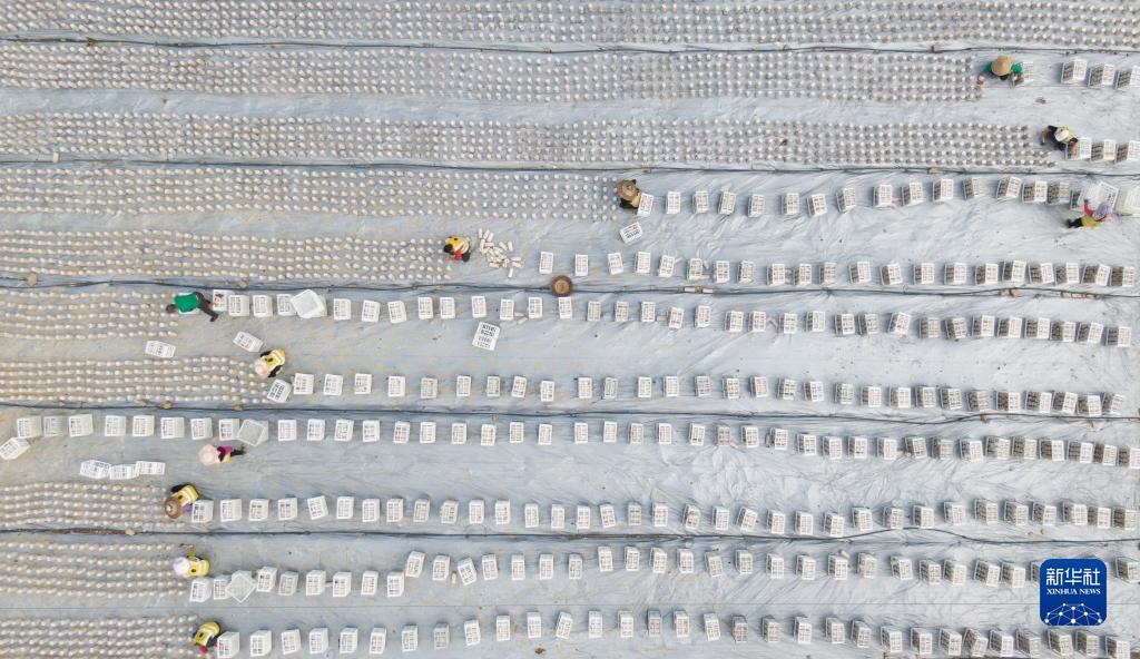 在貴州省銅仁市萬山區(qū)敖寨鄉(xiāng)中華山村食用菌種植基地,農(nóng)民在田間擺放菌棒(4月4日攝,無人機(jī)照片)。(新華社發(fā) 彭俊 攝)