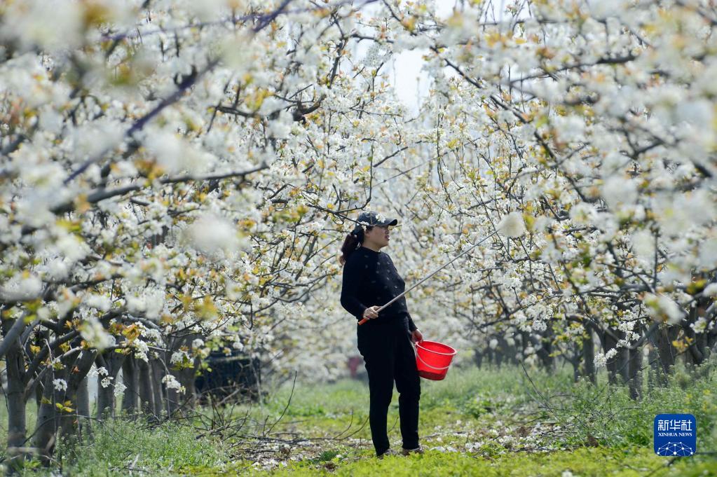 在河南省駐馬店市汝南縣宿鴨湖街道五里崗村,當(dāng)?shù)毓r(nóng)為梨樹人工授粉(4月1日攝)。(新華社發(fā) 孫凱 攝)