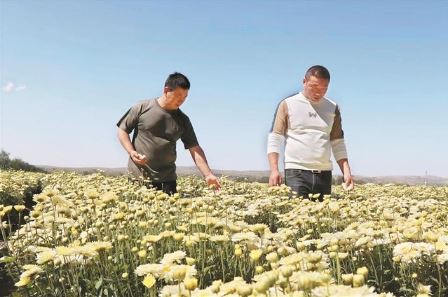 有了方向,行動是關(guān)鍵。黨員徐大衛(wèi)主動請纓,第一時間不遠千里趕赴菊花主產(chǎn)區(qū)射陽考察菊花種植項目,經(jīng)過充分分析研判,篩選適宜五寨種植的品種,最終選定北京菊試種。同時,他帶著誠意誠心,從射陽請來3名技術(shù)專家。在晉西北中藥材產(chǎn)業(yè)孵化園附近,他與3位專家同吃同住,深入田間地頭,與群眾同勞作、共生活。依據(jù)菊花種植要求,手把手教會群眾平整土地、開挖溝槽、栽種澆水、鋤草施肥和采挖收儲等中藥材精耕細作技術(shù)。針對菊花農(nóng)殘、重金屬超標(biāo)的問題,在試種過程中,他精心研究、反復(fù)摸索,大膽探索出了一套適用于菊花的種植技術(shù),實現(xiàn)了菊花農(nóng)殘可控的突破,先試種的100畝菊花,獲得了成功。