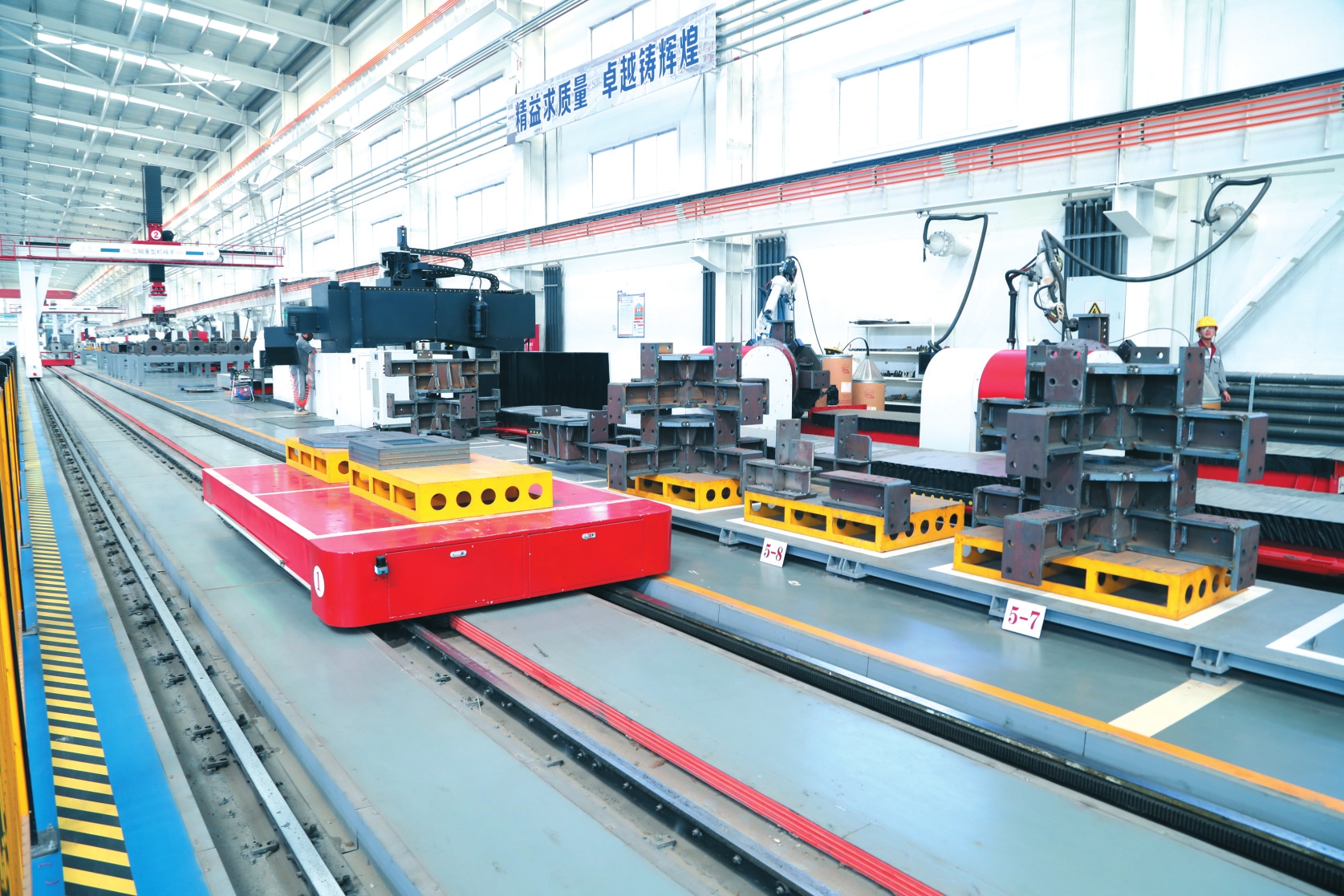 比如全流程智能化作業(yè)的鋼結(jié)構(gòu)構(gòu)件成品焊接生產(chǎn)線,通過三軸機(jī)械手、雙軸旋轉(zhuǎn)變位機(jī)、焊接機(jī)器人等智能設(shè)備實現(xiàn)精準(zhǔn)組裝、焊接。經(jīng)激光檢測確保構(gòu)件精度后,由打磨機(jī)械手完成自動化焊縫處理,再通過端面精銑和拋丸工藝提升成品質(zhì)量,最后在全封閉的智能噴涂工作站完成涂裝烘干。構(gòu)件精度,居然精確到“絲”。