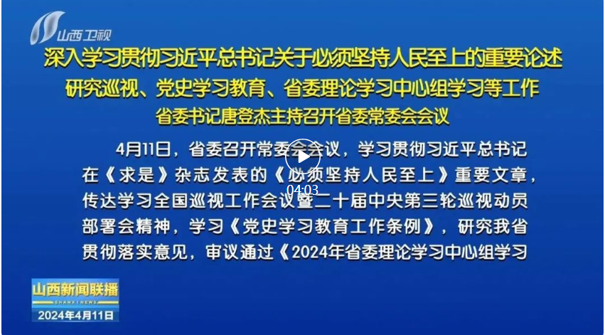 山西日?qǐng)?bào)報(bào)道 4月11日,省委召開常委會(huì)會(huì)議,學(xué)習(xí)貫徹習(xí)近平總書記在《求是》雜志發(fā)表的《必須堅(jiān)持人民至上》重要文章,傳達(dá)學(xué)習(xí)全國(guó)巡視工作會(huì)議暨二十屆中央第三輪巡視動(dòng)員部署會(huì)精神,學(xué)習(xí)《黨史學(xué)習(xí)教育工作條例》,研究我省貫徹落實(shí)意見,審議通過《2024年省委理論學(xué)習(xí)中心組學(xué)習(xí)計(jì)劃》。省委書記唐登杰主持會(huì)議。