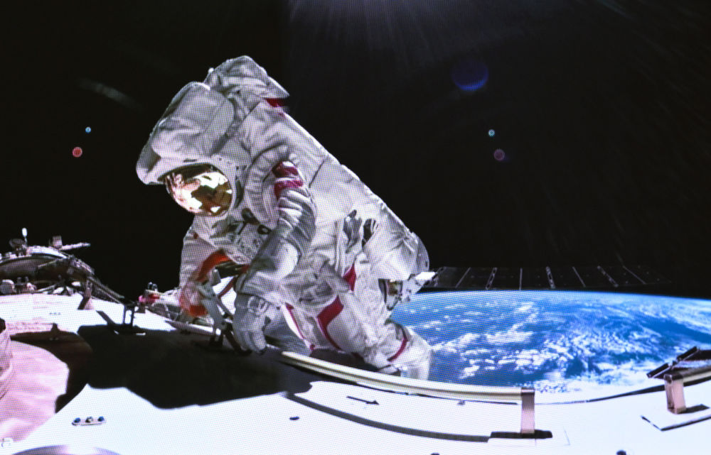 這是2024年3月2日在北京航天飛行控制中心拍攝的神舟十七號(hào)航天員湯洪波在空間站組合體艙外作業(yè)的畫面。