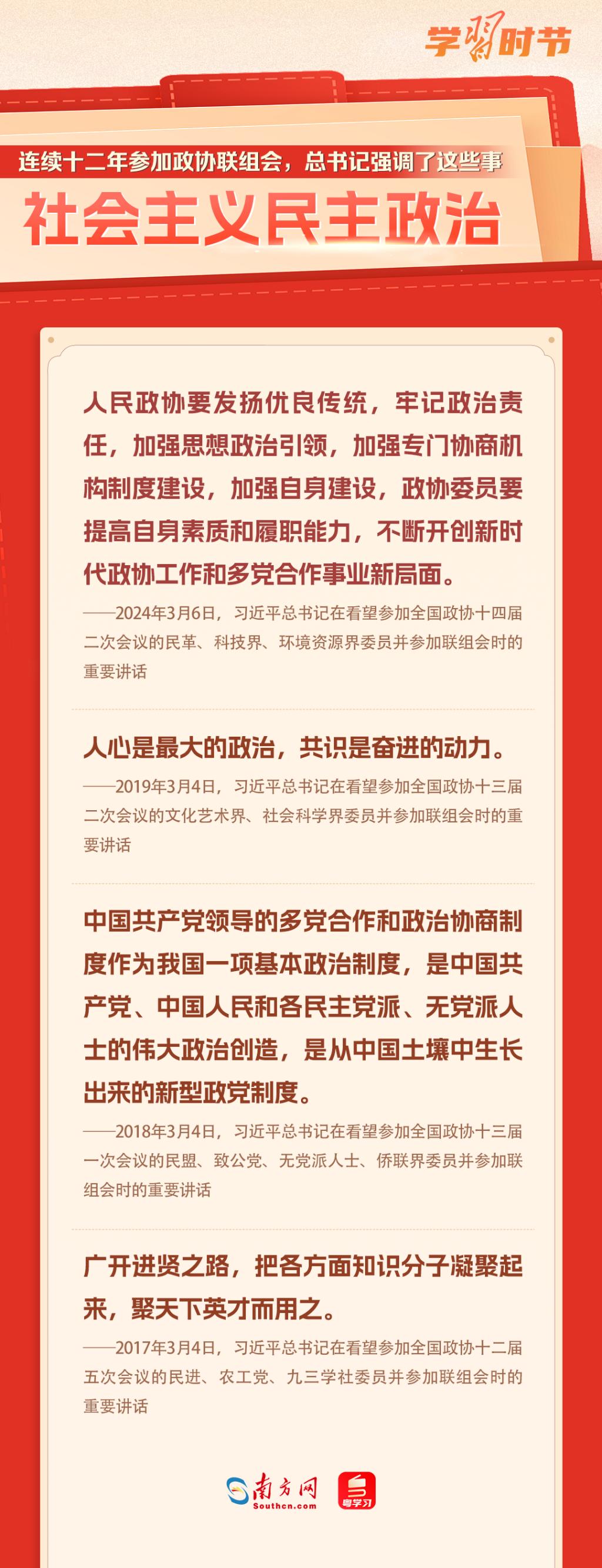 中國共產(chǎn)黨領(lǐng)導(dǎo)的多黨合作和政治協(xié)商制度是我國的一項基本政治制度。黨的十八大以來,習(xí)近平總書記每年都參加政協(xié)聯(lián)組會,對社會主義民主政治、民營經(jīng)濟(jì)、自主創(chuàng)新、鄉(xiāng)村振興、社會保障、文化自信、國家統(tǒng)一等作出重要論述,讓我們一起重溫金句!