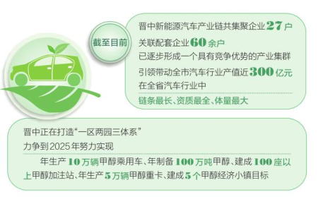 目前,晉中正在打造“一區(qū)兩園三體系”,即以國家級甲醇經(jīng)濟示范區(qū)為引領(lǐng),以汽車裝備制造園和綠色甲醇循環(huán)經(jīng)濟產(chǎn)業(yè)園為支撐,形成核心主導(dǎo)產(chǎn)業(yè)、支撐服務(wù)產(chǎn)業(yè)、示范應(yīng)用場景三大產(chǎn)業(yè)體系。力爭到2025年努力實現(xiàn)年生產(chǎn)10萬輛甲醇乘用車、年制備100萬噸甲醇、建成100座以上甲醇加注站、年生產(chǎn)5萬輛甲醇重卡、建成5個甲醇經(jīng)濟小鎮(zhèn)目標(biāo),建設(shè)“車、醇、運、站、捕”全鏈條的經(jīng)濟生態(tài),打造原料生產(chǎn)、汽車制造、服務(wù)配套、基礎(chǔ)支撐、場景應(yīng)用的全產(chǎn)業(yè)鏈?zhǔn)痉堵肪€,推動甲醇汽車應(yīng)用規(guī)模向萬輛進(jìn)軍,打造千億級甲醇經(jīng)濟高能級產(chǎn)業(yè)版圖。