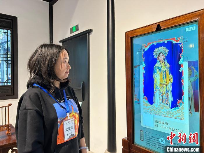 近期,蘇州古城32號街坊的江蘇按察使署舊址舉辦“匠海拾遺—沉浸式名城非遺文化體驗展”。圖為工作人員展示昆曲AI換臉拍照體驗過程。國璇 攝