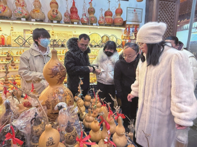 在吆喝聲此起彼伏的年貨市集,醒獅帽、剪紙、提燈等頗具年味的商品擺滿攤位,讓游客目不暇接,尤其是精美的葫蘆烙畫(huà)、面塑、扎染等非遺,既有傳統(tǒng)文化的風(fēng)韻,又融入現(xiàn)代設(shè)計(jì)巧思。