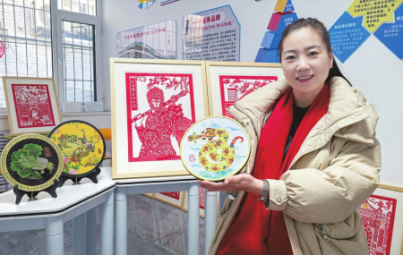 非物質(zhì)文化遺產(chǎn)代表性傳承人董淑芳展示她用非遺掐絲砂畫工藝制作的傳統(tǒng)美術(shù)作品“福蛇報(bào)春”。本報(bào)記者高樺攝