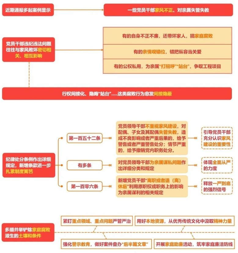 新修訂的《中國共產(chǎn)黨紀(jì)律處分條例》第一百五十二條對(duì)黨員領(lǐng)導(dǎo)干部“不重視家風(fēng)建設(shè),對(duì)配偶、子女及其配偶失管失教,造成不良影響或者嚴(yán)重后果”的情況作出規(guī)定,引導(dǎo)黨員干部充分認(rèn)識(shí)家風(fēng)建設(shè)的重要性。