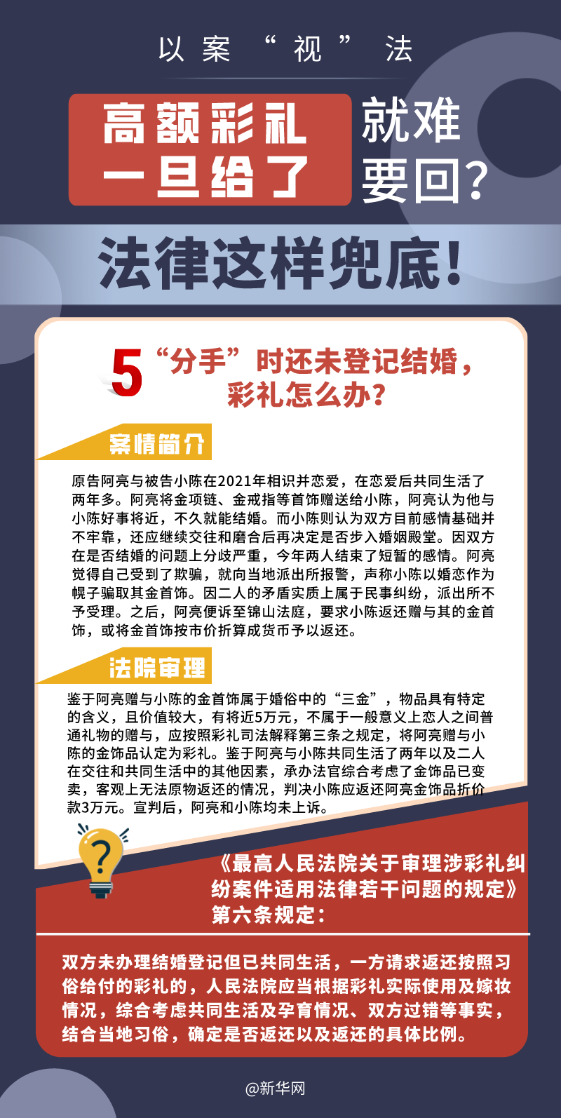 “五一”長假期間,各地迎來了婚禮高峰期,“彩禮”話題,尤其農(nóng)村高額彩禮現(xiàn)象備受關(guān)注。破解高價(jià)彩禮,在解決爭議的層面,司法盡了最大努力兜底。本期《以案“視”法》針對涉“高額彩禮”糾紛,帶大家學(xué)習(xí)相關(guān)法律知識。